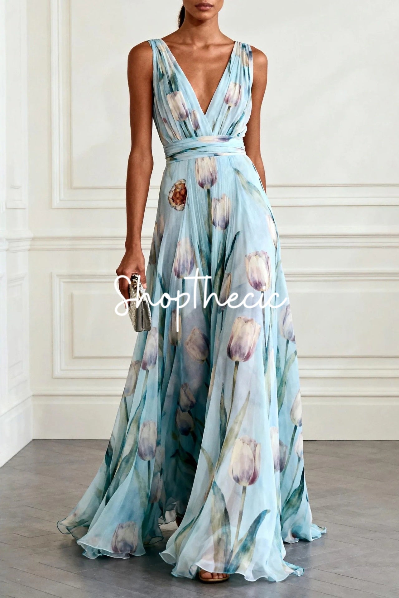 Tulip Print Sleeveless V-Neck Chiffon Maxi Dress$66.00 USD$99.00 USD