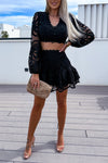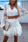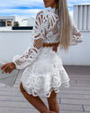 Hollow embroidered cropped long-sleeved top and skirt two-piece set