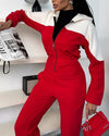 Color-blocked zipper fleece long-sleeved hooded jumpsuit