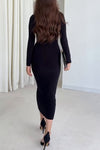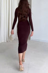 This solid color long sleeve dress combines a high collar design with an exposed waist detail, creating a sleek and modern silhouette. Its slim fit contours the hips, offering a flattering shape that highlights the waistline. Crafted for an elegant yet confident appearance, it works perfectly for both professional environments and stylish social occasions.