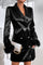Schwarzes zweireihiges Anzugkleid aus Satin mit Pelzbesatz