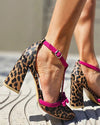 These leopard color-block high-heeled sandals feature an elegant bow strap that enhances both style and stability. The bold color-block design adds a fashionable edge, while the high heel provides a flattering lift for an elevated look. Crafted to combine sophistication and comfort, they are ideal for making a confident statement at any event.
