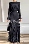 Long-sleeved top with ruffled hem and fitted long skirt two-piece set