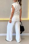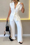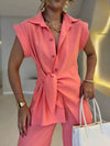 This two-piece set features a tie-waist short-sleeved shirt paired with high-waisted pants, combining modern style and tailored comfort. The adjustable tie waist enhances fit and silhouette, while the high-rise pants offer a flattering shape and added support. Ideal for versatile wear, this ensemble balances professional appeal with relaxed ease, making it suitable for both office settings and casual outings.
