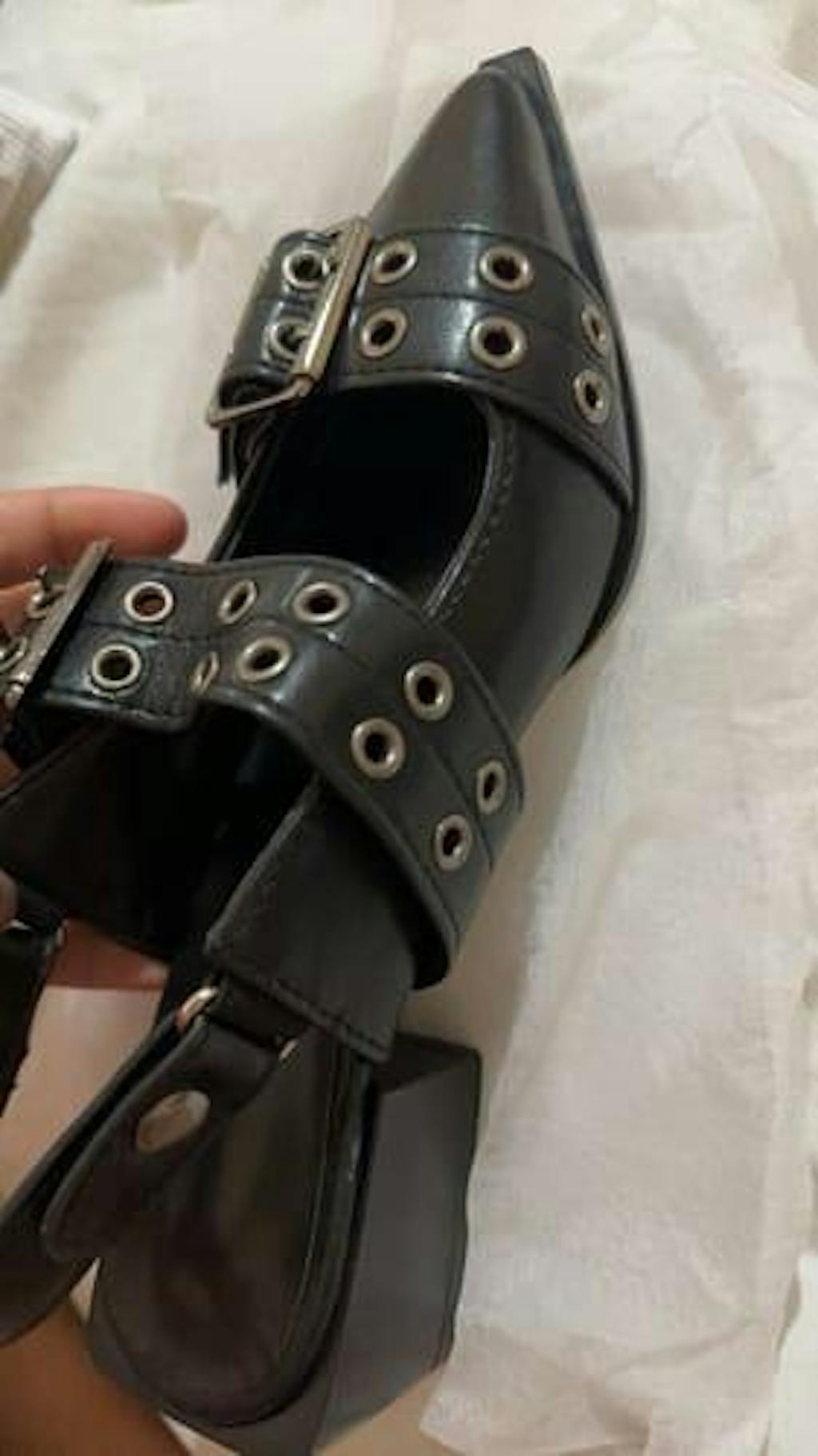 Retro meets trendy in these pointed-toe leather oxfords. Copper rivets and double buckle straps revamp the lace-up style with edge and attitude. The thick lug sole and stacked heel bring a bold, chunky profile to any look.