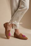 Step into effortless style with these charming brown suede slip-on loafers, elevated by delightful pink tassel accents. The soft suede upper offers a luxe feel, while the slip-on design means zero fuss getting ready. Perfect for adding a pop of personality to your everyday look—whether you're heading to brunch or running errands. Comfort meets whimsy in a shoe that's as fun as it is functional.