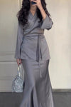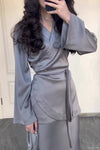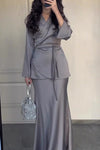 Shine in intricate detail. This satin set combines delicate patchwork design with a flattering waist-cinching fit, offering a luxurious and tailored look that transitions from dinner dates to evening celebrations.