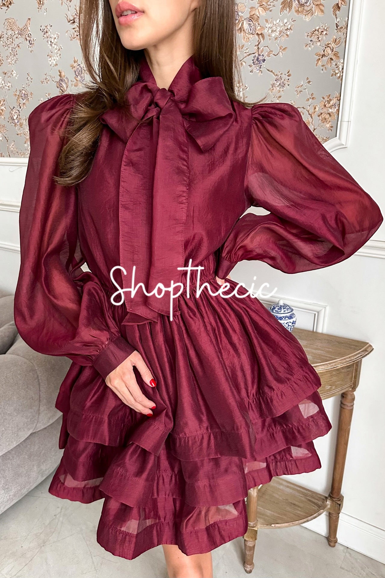 Twirl into the spotlight with this burgundy mini skirt that's equal parts romantic and bold. Featuring charming lantern sleeves that frame the shoulders with whimsical volume and a delicate bow detail, this piece brings instant personality to any outfit. The tiered skirt design creates beautiful movement and dimension, perfect for dancing, date nights, or whenever you want to feel fabulous. A playful take on classic elegance that'll have you feeling confident and chic.
