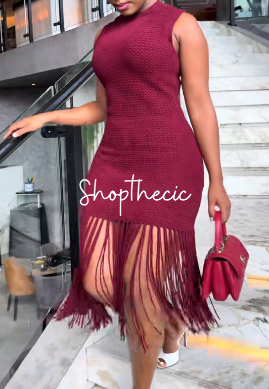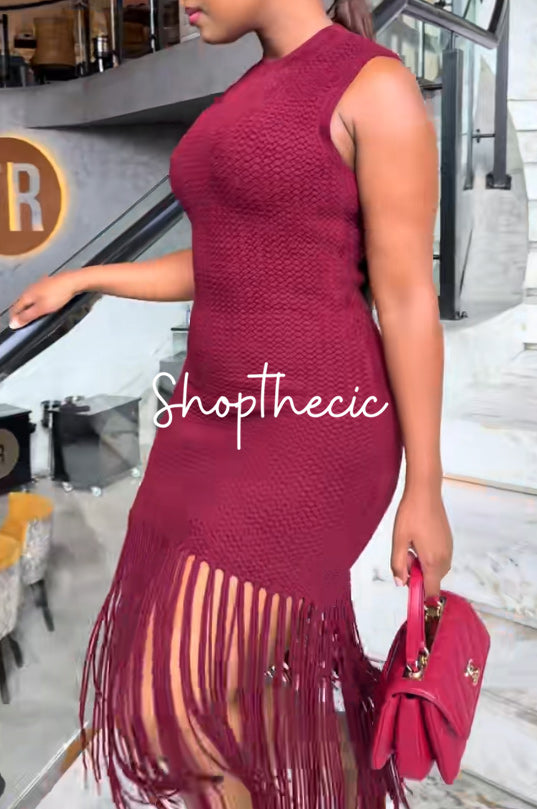 Slip into effortless elegance with this deep red sleeveless knit dress—a wardrobe essential that transitions seamlessly from day to night. The soft, breathable knit fabric hugs your curves in all the right ways, while the playful tassel hem adds a cheeky touch of personality. Perfect for layering over a tee or styling solo, this versatile piece proves that sometimes the simplest designs make the boldest statements. Go ahead, make red your signature color.