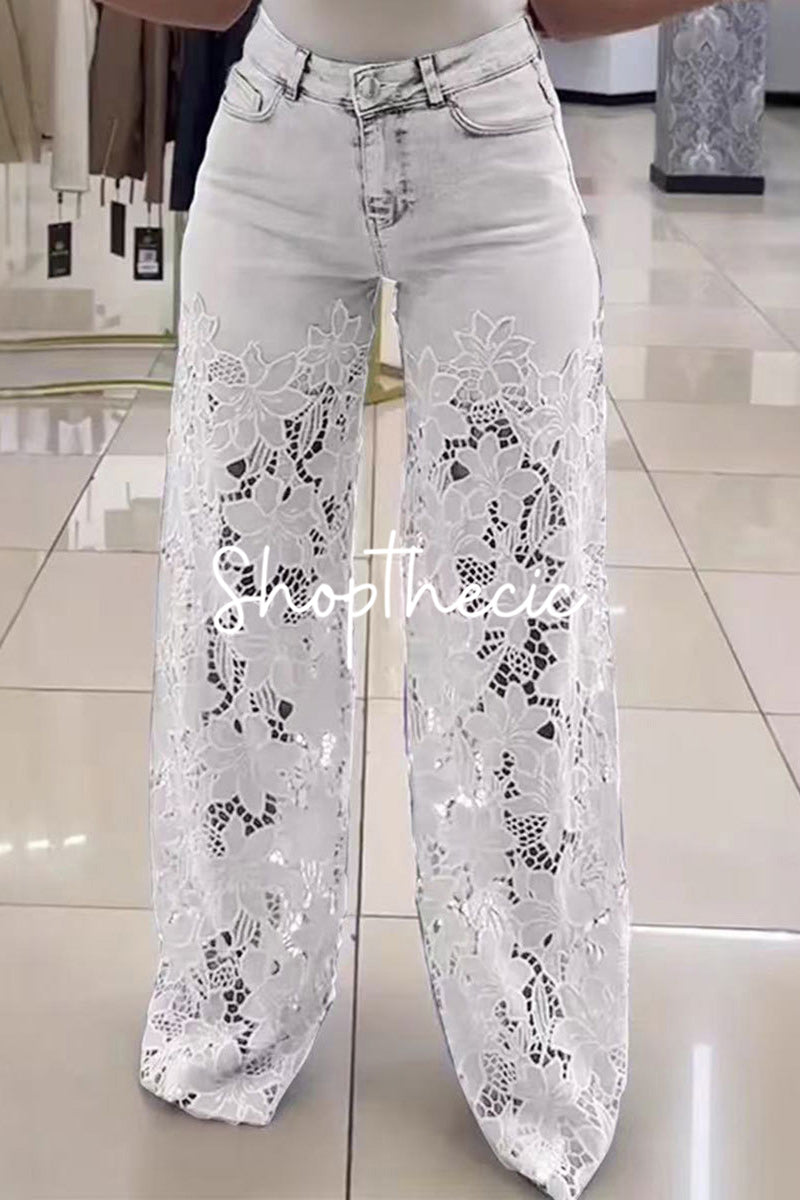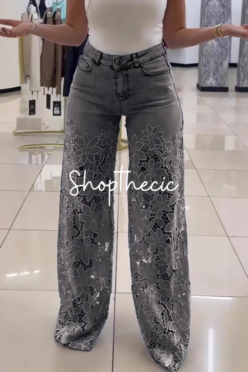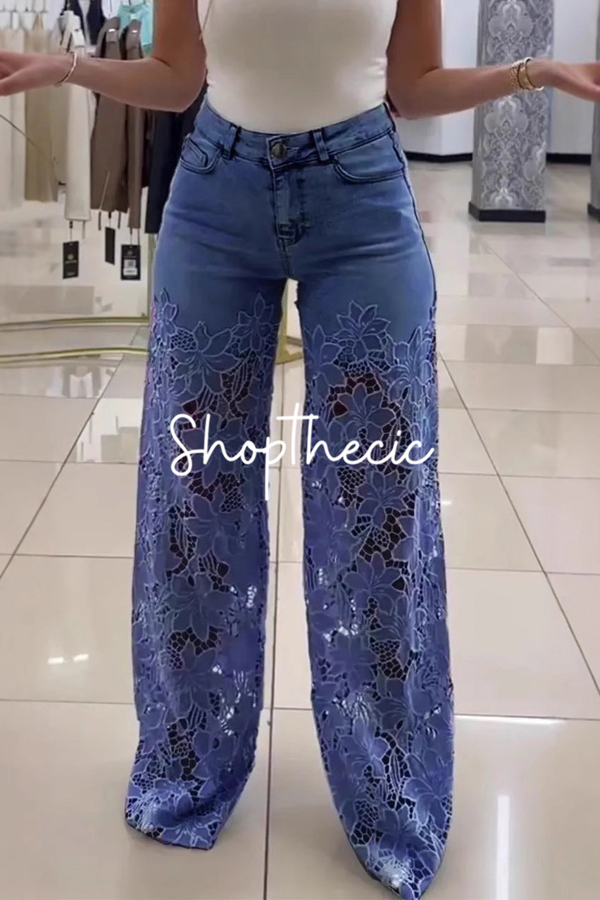 Elevate your denim game with these show-stopping high-waisted jeans that blend classic silhouette with modern edge. Delicate lace trim and intricate openwork detailing create an unexpectedly romantic vibe, while the flattering high rise cinches at the waist for a timeless, figure-hugging fit. Perfect for layering over slip dresses or pairing with crop tops, these jeans transform any outfit from basic to bold. Whether you're dressing up for a night out or keeping it casual, this playful take on traditional denim proves that sometimes the best style moments happen when you break the rules.
