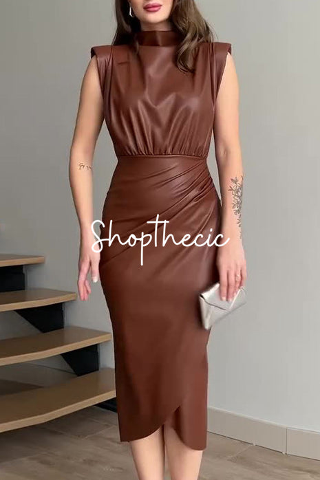 Slip into sleek sophistication with this show-stopping PU leather midi dress. The round neckline keeps things classic while the sleeveless cut shows off your shoulders in style. Cinch that waist to highlight your curves, then let the hip-hugging silhouette do the talking as it flows to a chic midi length. Perfect for turning heads at parties, date nights, or whenever you're ready to feel absolutely fabulous. Edgy, elegant, and undeniably fun.