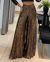 Elevate your evening wardrobe with these striking sequined wide-leg pants. Crafted with a high-waisted silhouette that flatters and elongates, they feature an all-over sequin finish that catches light beautifully for maximum impact. The straight-leg cut provides a polished, contemporary fit that works equally well for cocktail events or statement-making nights out. Pair with a sleek top to let these show-stopping bottoms take center stage, or layer under a blazer for sophisticated versatility. Perfect for those ready to make a luminous entrance.