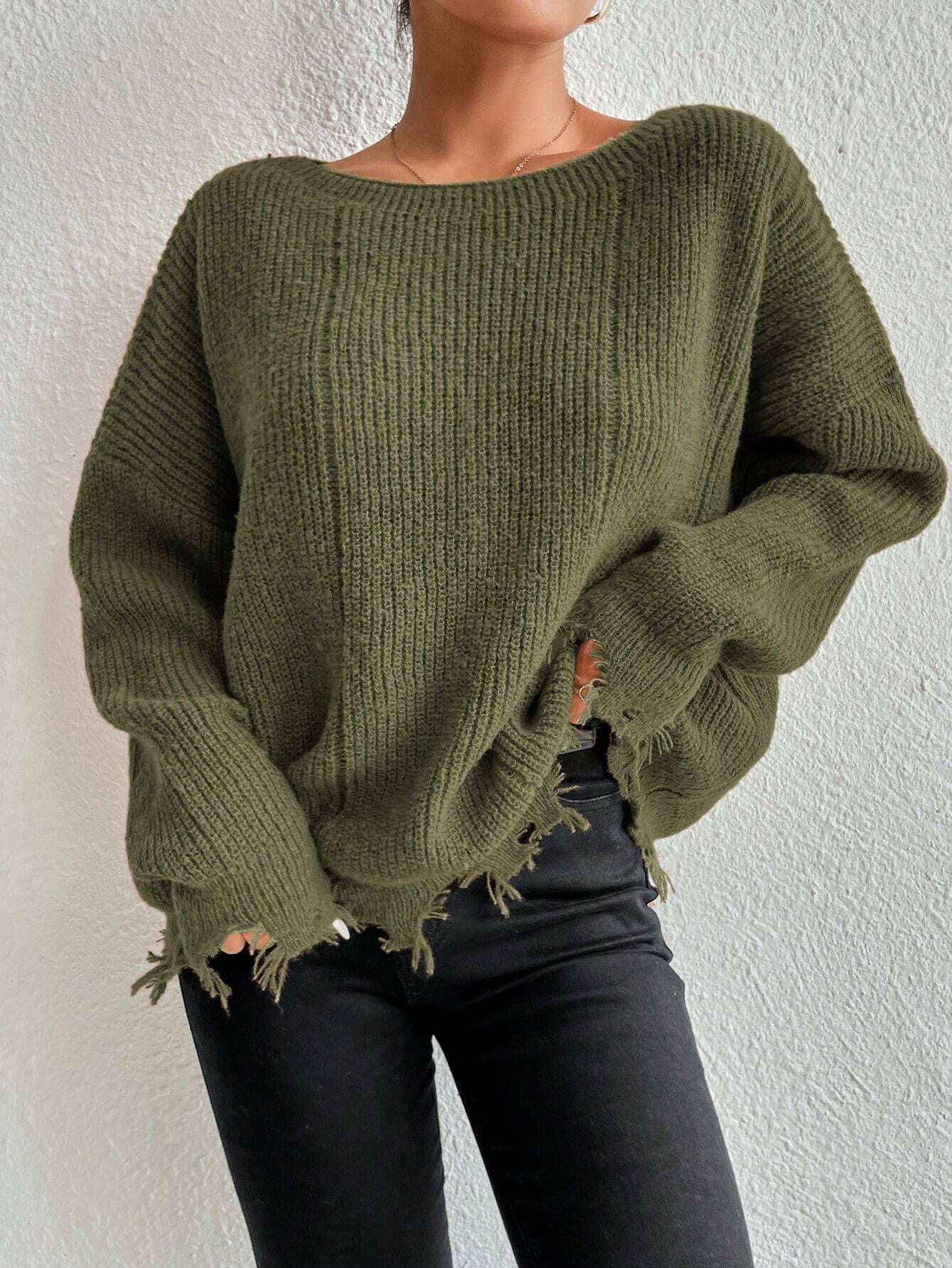 This solid color sweater features a round neck and a loose knit construction, offering both comfort and breathability. Its ripped design adds an edgy, fashion-forward touch while maintaining a relaxed...