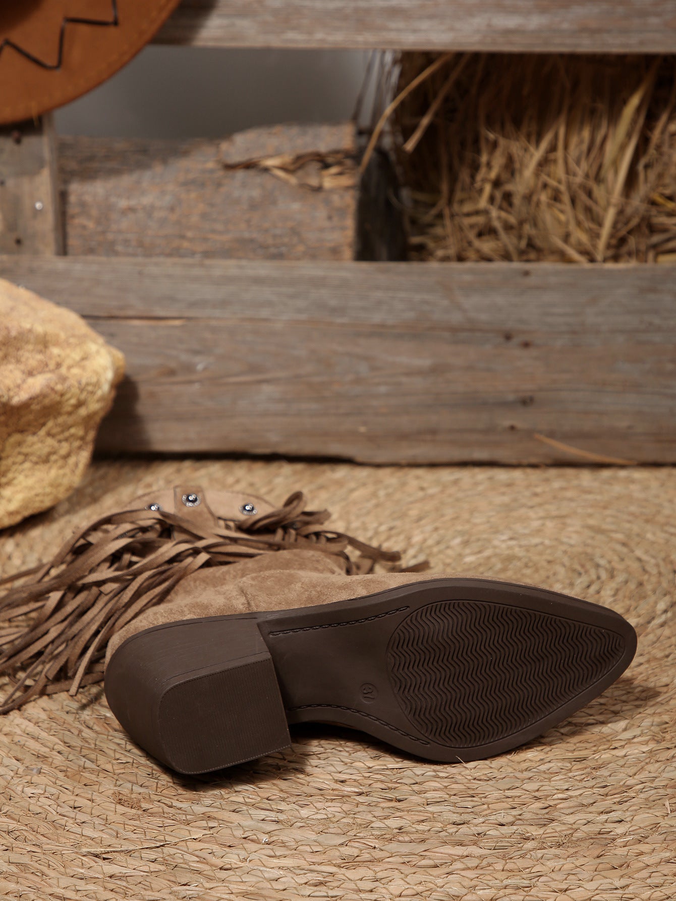 The Guardian Tassel rivet chunky heeled ankle boots combine sturdy construction with refined detailing. Featuring a durable chunky heel for stability and comfort, these boots are enhanced by decorative tassels...